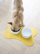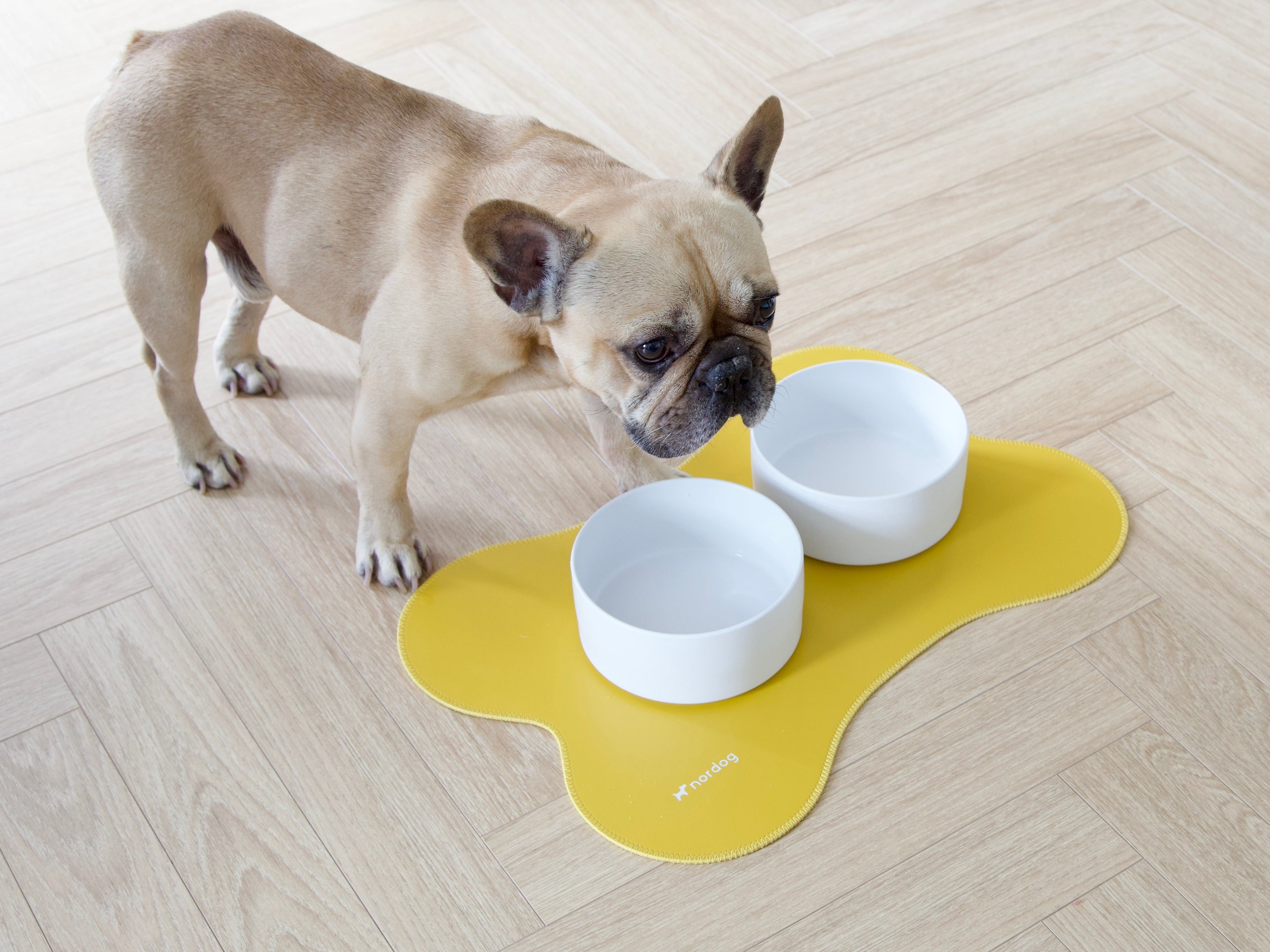 The placemat from Nordog is made of a waterproof material and is shaped like a dog bone. The placemat protects your floor from stains. You can clean the placemat with a wet cloth.